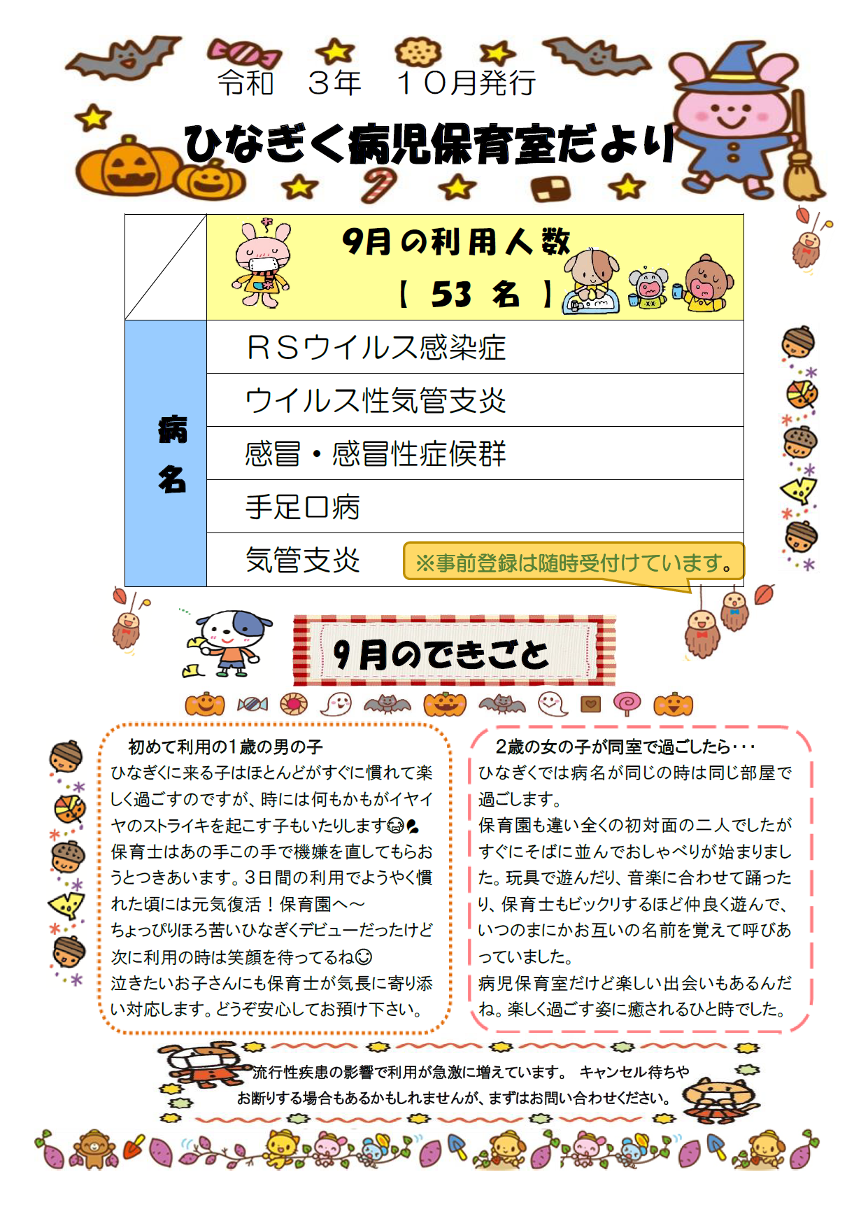 9月は体調を崩すお子さんも多く連日多くの病児保育室の利用がありました。