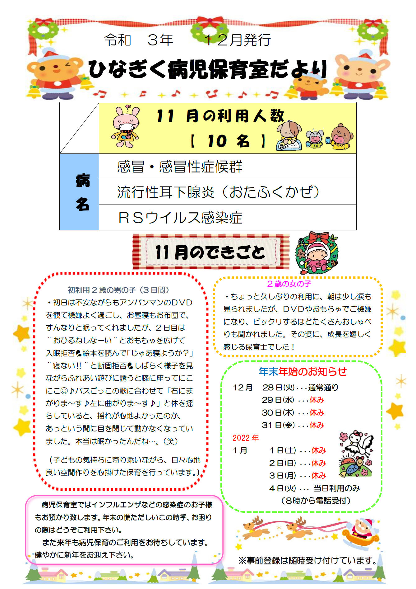 今年度はひなぎく病児保育室でのお子様とのやりとり、