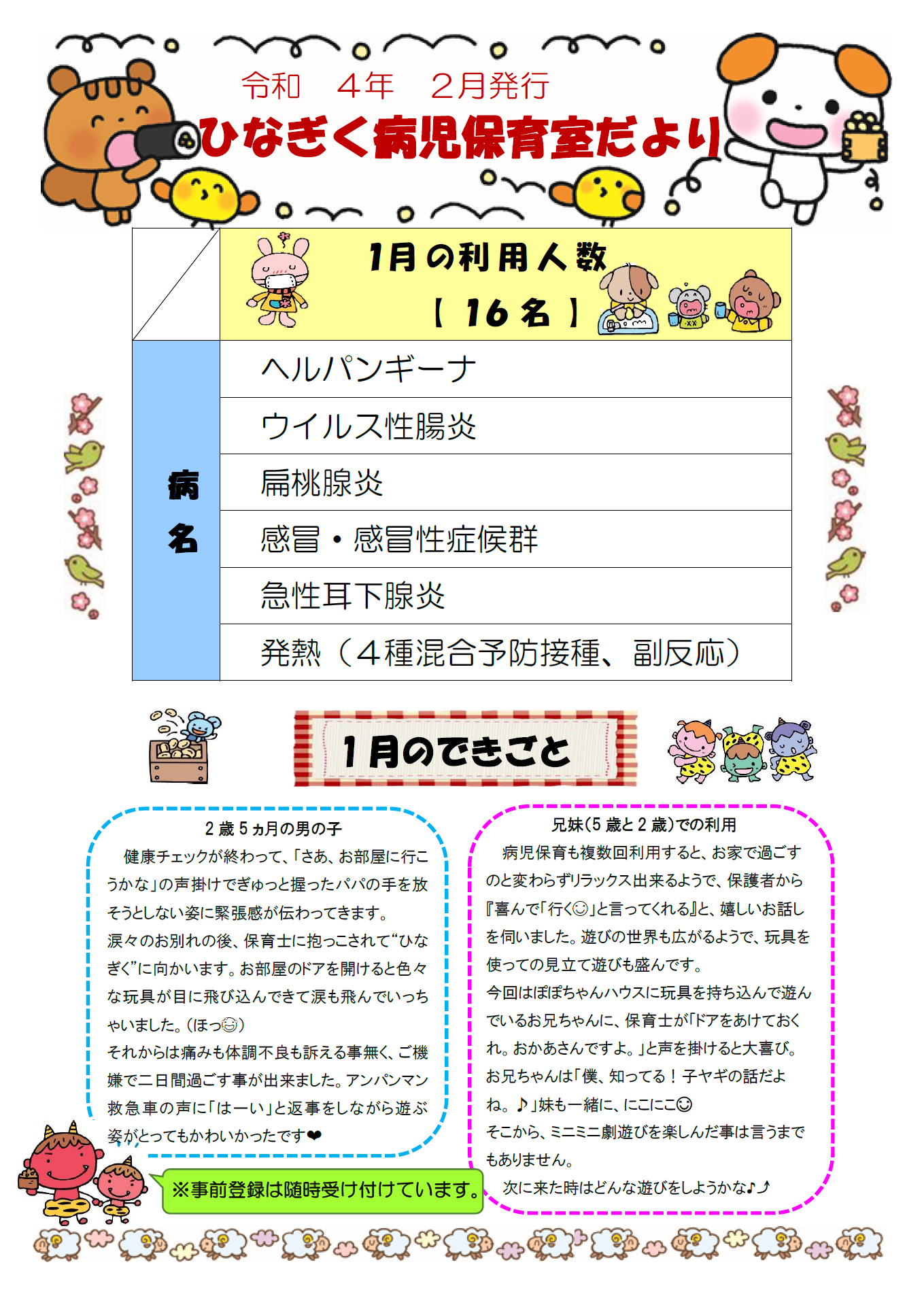 今年度はひなぎく病児保育室でのお子様とのやりとり、
