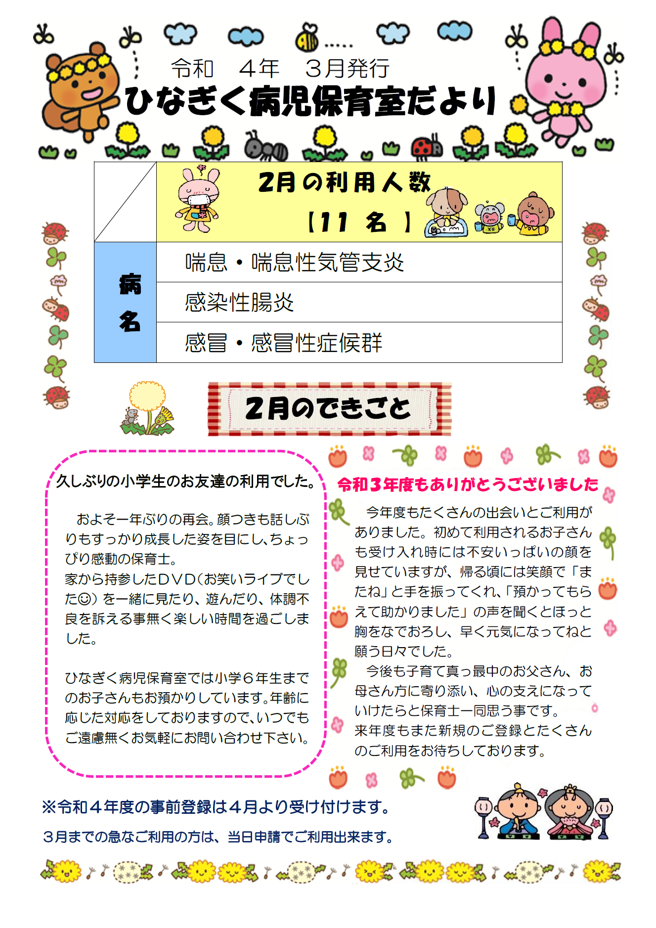 令和3年度の『ひなぎく病児保育室だより』は最後になります。