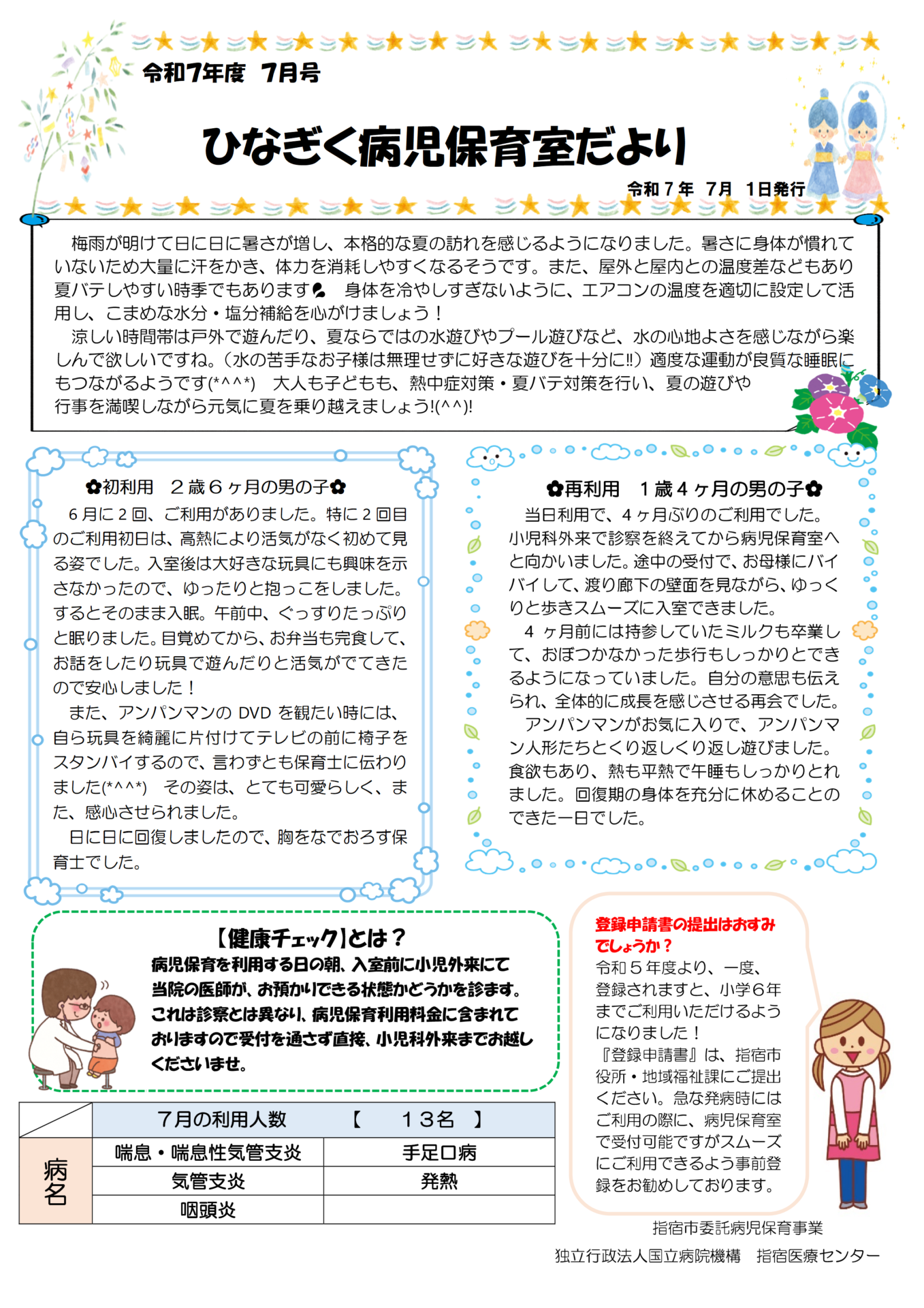 ★「令和7年度7月号ひなぎく病児保育室だより」ができました。