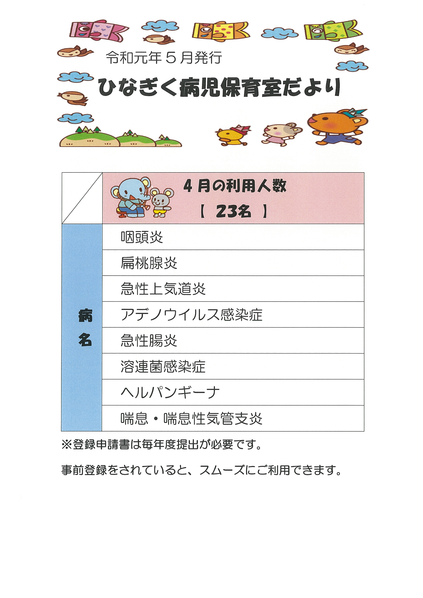 ホーム » 5月ひなぎく病児保育室だより5月ひなぎく病児保育室だより2019年8月20日2019年8月21日病児保育室だより『ひなぎく病児保育室だよりができました! 毎月、病児保育の利用人数や病名をお知らせしていきます。』