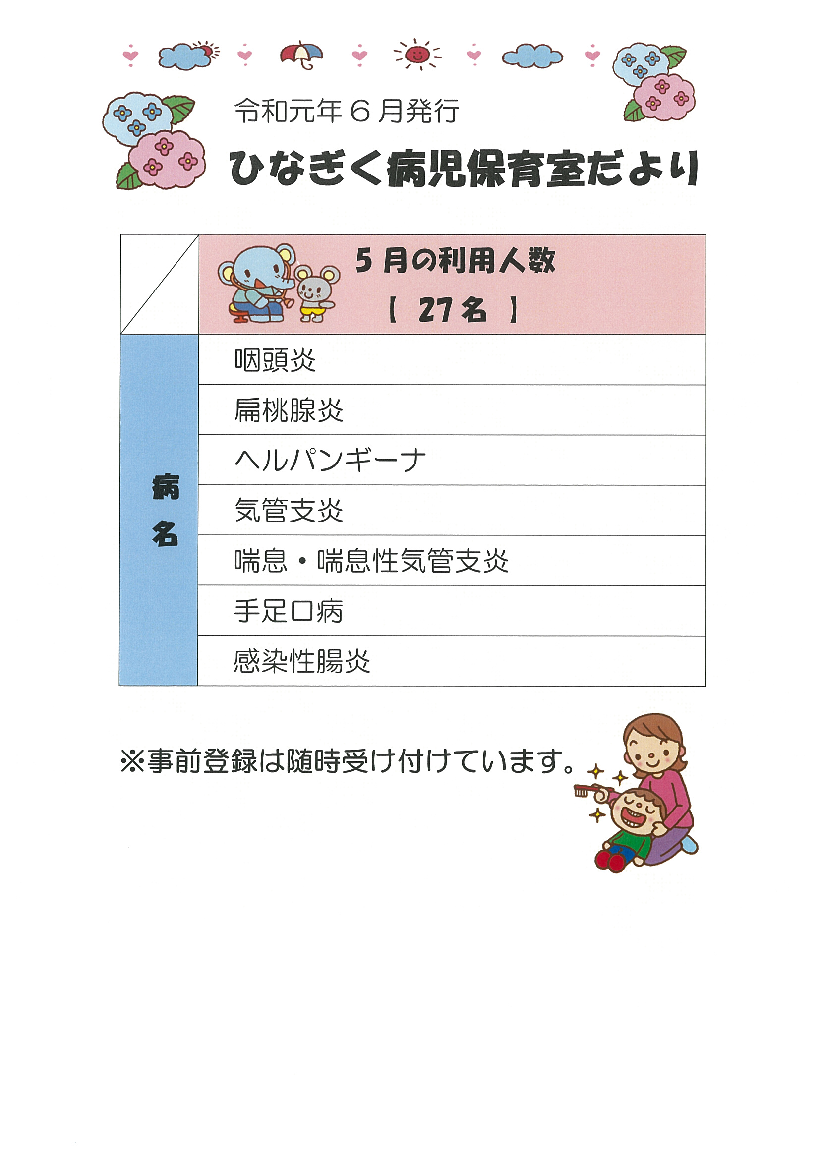 ホーム » 6月ひなぎく病児保育室だより6月ひなぎく病児保育室だより2019年8月20日2019年8月21日病児保育室だより『ひなぎく病児保育室だよりができました! 毎月、病児保育の利用人数や病名をお知らせしていきます。』