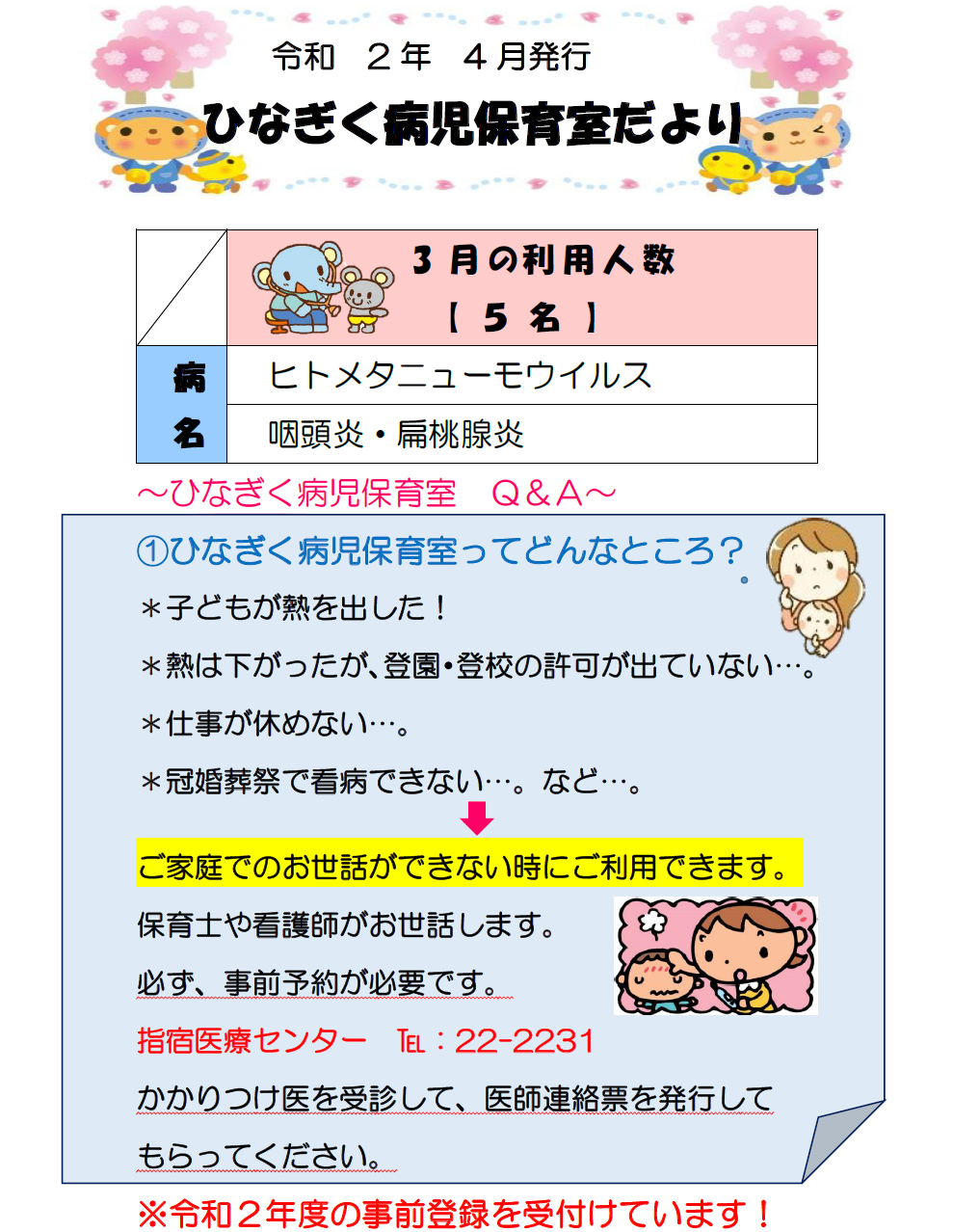 今年度は、ひなぎく病児保育室利用についてのQ&Aをご紹介していきたいと思います。