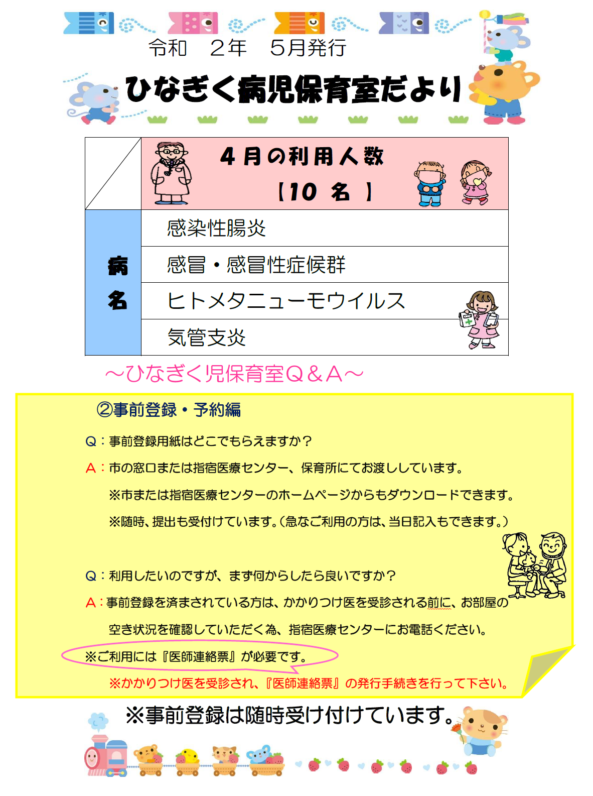 ホーム » 5月ひなぎく病児保育室だより5月ひなぎく病児保育室だより2020年5月14日病児保育室だより5月のおたよりできました! 今年度は、ひなぎく病児保育室利用についてのQ&Aをご紹介していきたいと思います。 ※スムーズにご利用していただく為に、事前登録のご協力をお願い致します。 ※ 登録用紙の受け取り・提出は、市役所又は指宿医療センターの窓口までお願い致します。 ・問い合わせにつきましては、指宿医療センターにお電話ください。 ↓ ※当日利用に関しては8時~、 ※前日予約に関しては9時~17時までで対応致しております。