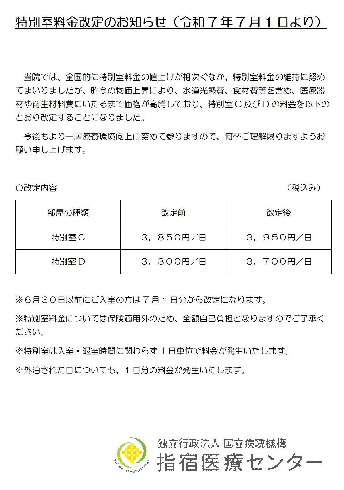 特別室D : 3,300円/日 改定後 特別室C : 3,950円/日