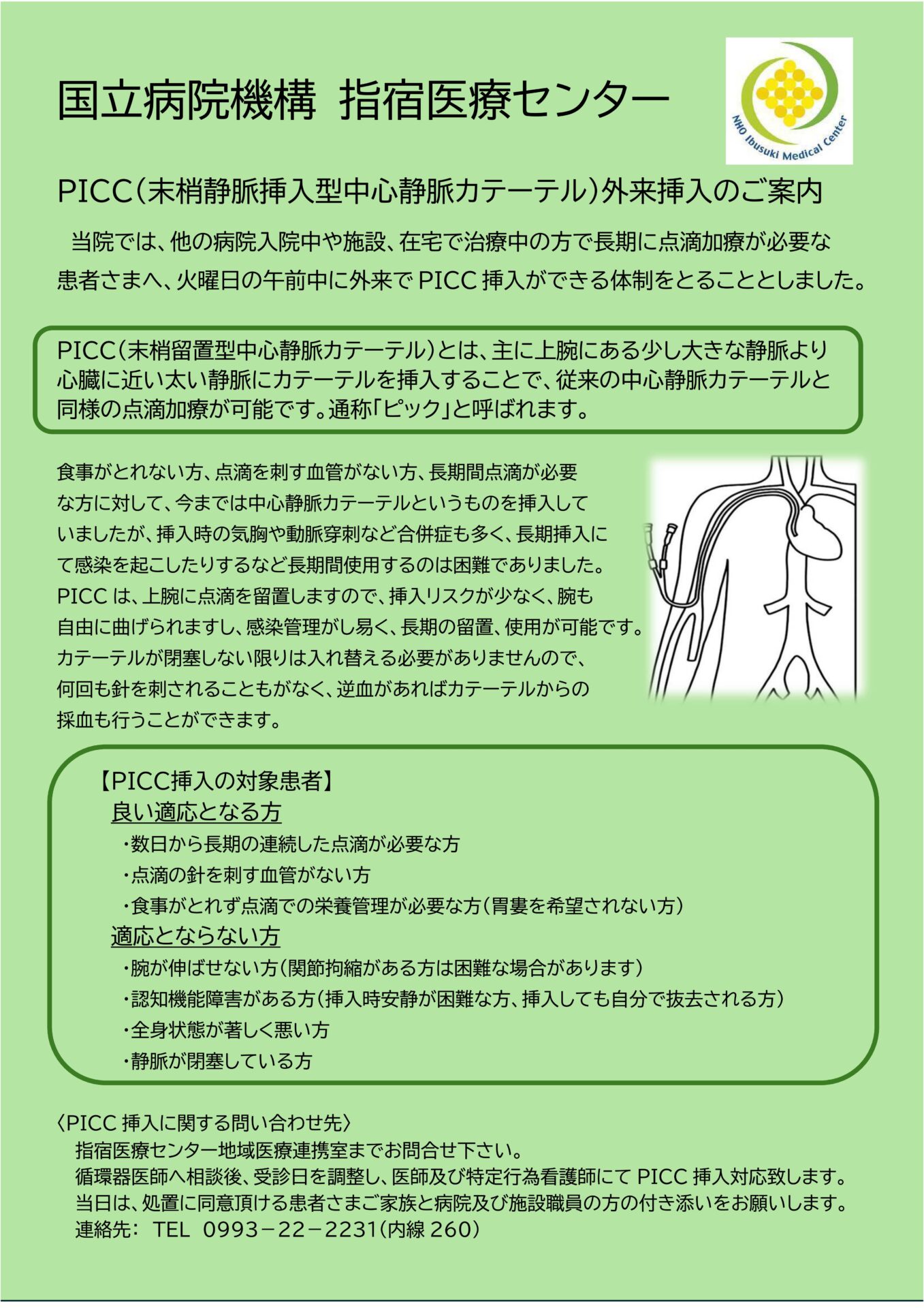 循環器内科医師へ相談後、受診日を調整し、医師及び特定行為看護師にてPICC挿入対応致します。